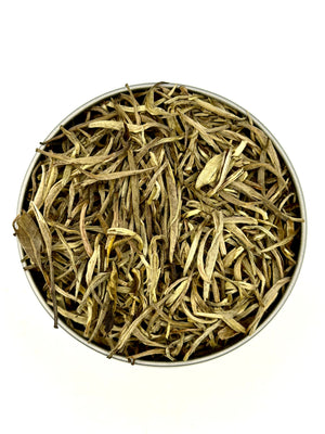 Blender's notes: Grown here! Divine! Gorgeous, downy, white silver tips grown at Light of Day Biodynamic Tea farm that have been scented right here in our kitchen with Lilac, Lily, Magnolia and Hosta blossoms to create a local “Jasmine” scent. Cured for over 4 months, then hand-sifted. 70,000 hand-picked buds for 1 finished pound of tea.! This tea is a masterpiece!